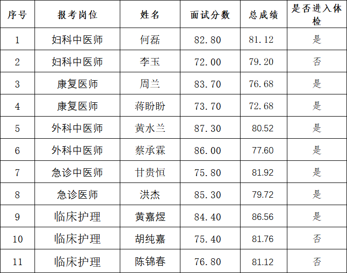 根据《惠州市惠城区中医医院关于2026年第一批编外人员招聘公告》要求,面试考核已于2月27日结束,现将各考生面试结果、总成绩及体检名单公布如下: